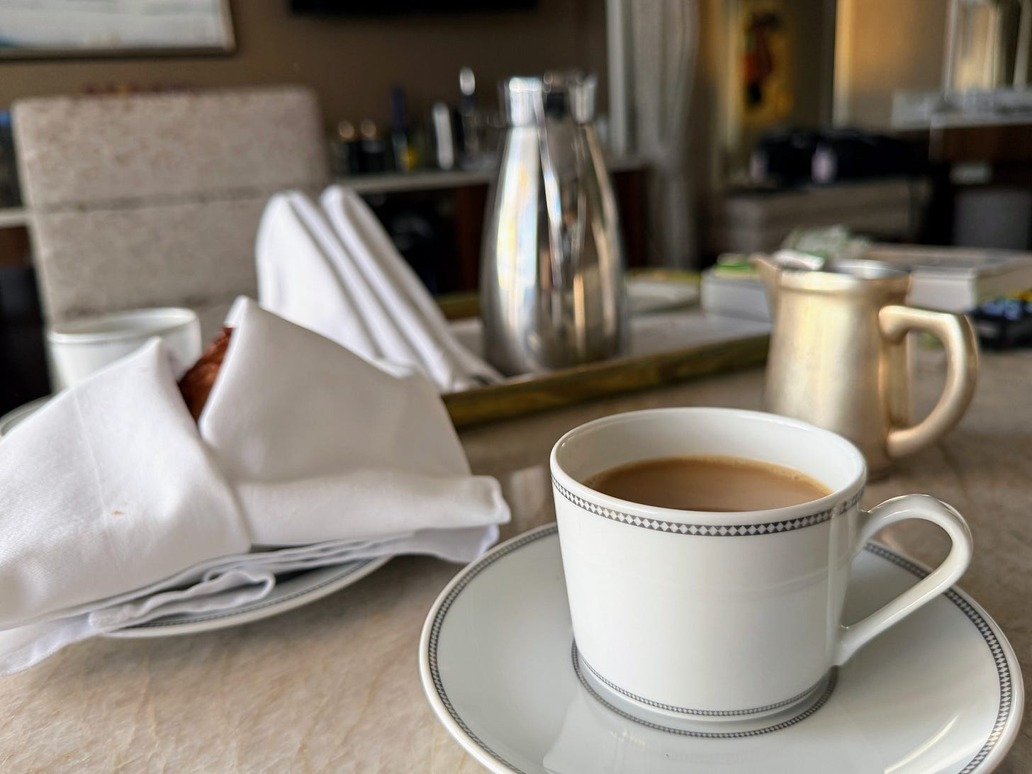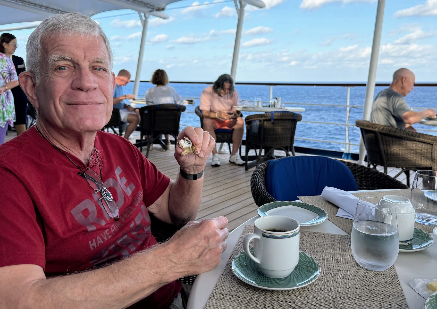 We started the last two mornings with coffee and muffins in our stateroom. We’ve requested a 6:30 delivery, asking that if we're still sleeping, the server will place it on the table and leave quietly. I was delighted when I woke up the past two mornings, wondering when our coffee would arrive, only to see it already there on the table!