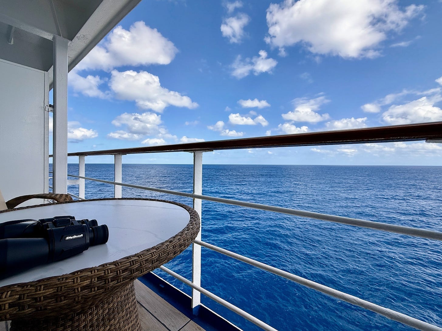 Binoculars are ready for when birds approach the ship. Today lots of brown boobies plus three masked boobies accompanied us as we sailed southwest toward the Lesser Antilles.